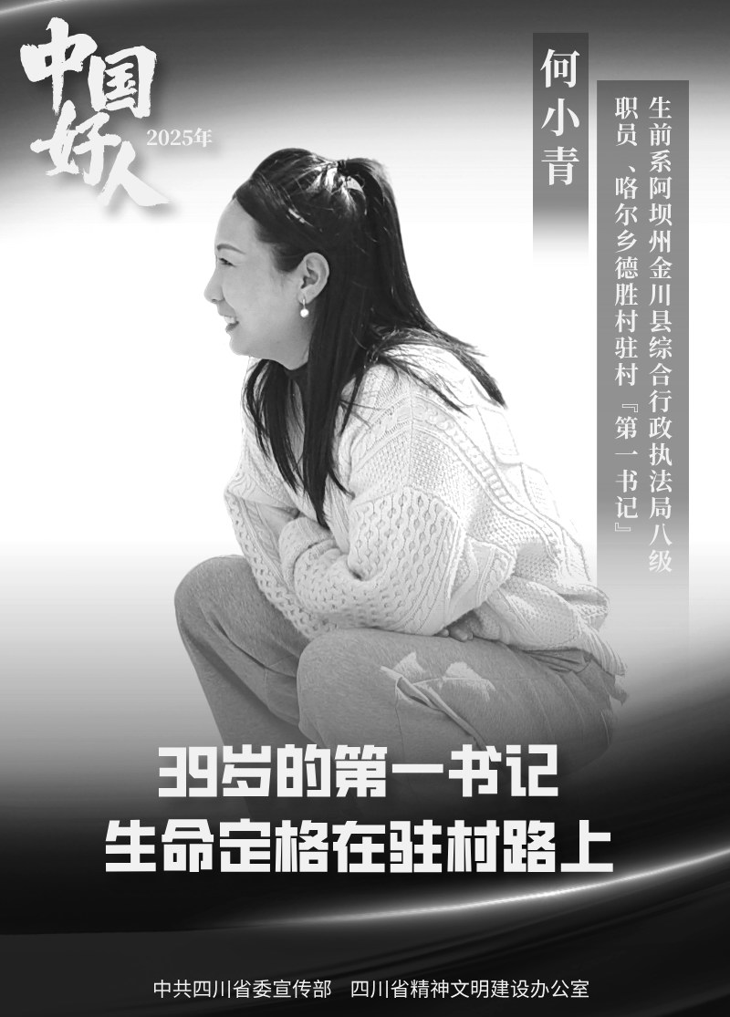 阿坝州金川县咯尔乡德胜村原驻村第一书记何小青,主动请缨扎根乡村振兴一线,推动防洪堤建设、振兴雪梨产业、化解林地征收补偿款分配难题……却在入户走访途中不幸坠河遇难,39岁的生命永远定格在帮扶路上,被村民称为“最美第一书记”,获评敬业奉献类“中国好人”。