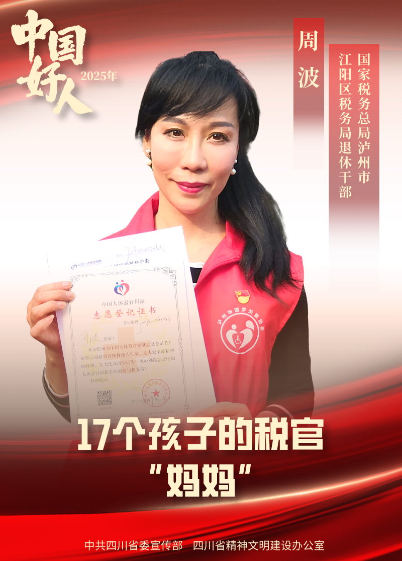 国家税务总局泸州市江阳区税务局退休干部周波,24年如一日,如明灯般照亮17名留守儿童与困难儿童的成长之路,被孩子们亲切地称为“江阳妈妈”。她以无私付出诠释“赠人玫瑰,手留余香”的人间真情,当选助人为乐类“中国好人”。