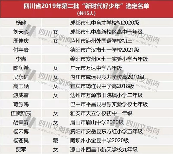 为引领广大未成年人立志向、有梦想,传承孝敬、友善、节俭、诚信的传统美德,弘扬民族精神和时代精神,经广泛发动、层层推荐、审核评定,杨畔、刘天心、周佳庆等15名同学当选2019年四川省第二批新时代好少年。(记者 吴忧)