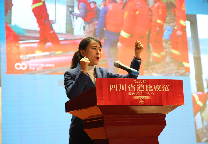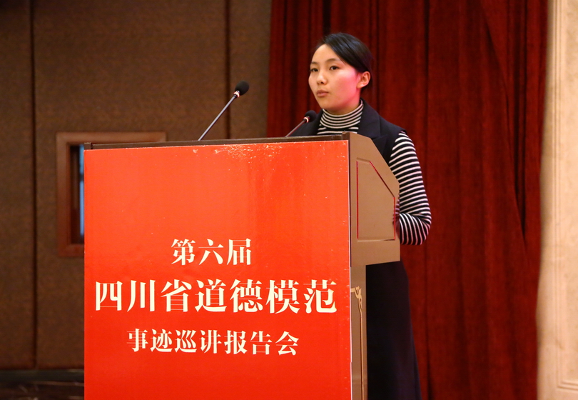 在第六届四川省道德模范事迹巡讲德阳站,第六届四川省助人为乐道德模范傅艳作报告。