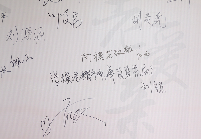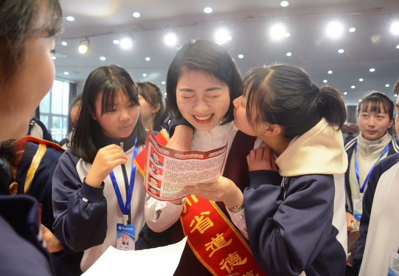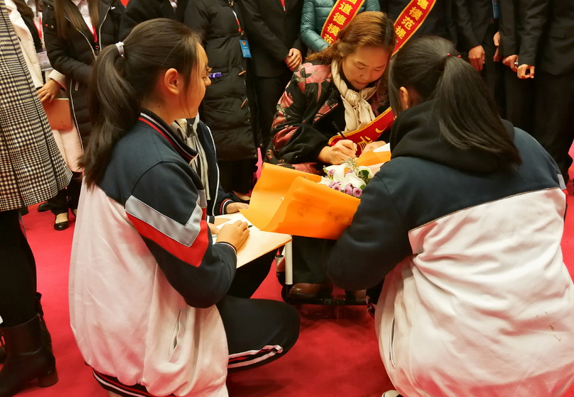 “粉丝”争相与道德模范拥抱、握手,图为谢北艳为学生寄语。