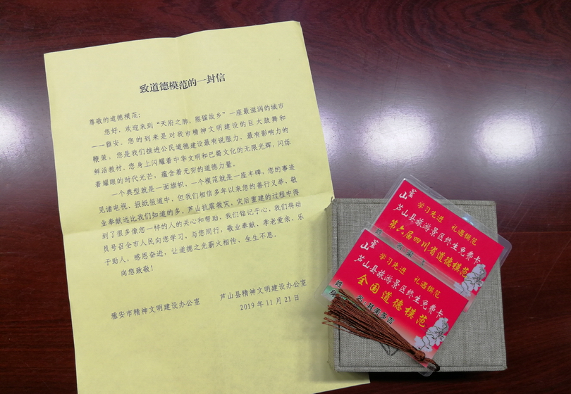 报告会现场,芦山县为道德模范们赠送了“芦山县旅游景区终生免费卡”。