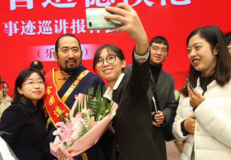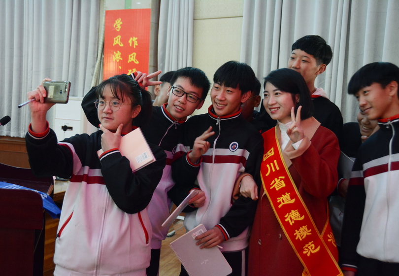 会后,很多人走上舞台与模范近距离接触,感受道德力量。图为学生们与张巧合影。