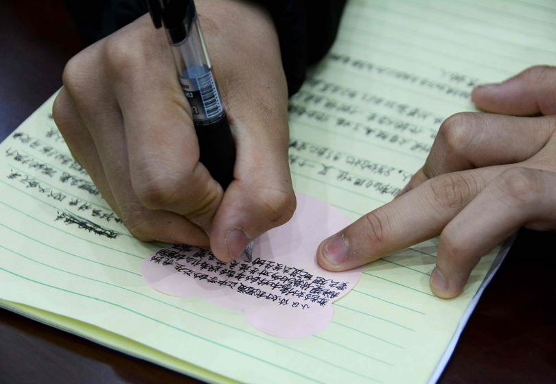 观众撰写便利贴,与道德模范分享的故事中的孩子“隔空对话”。