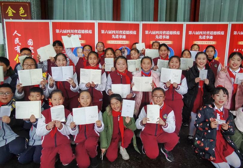 内江市实验小学的孩子们开心举着道德模范的签名合影留恋。