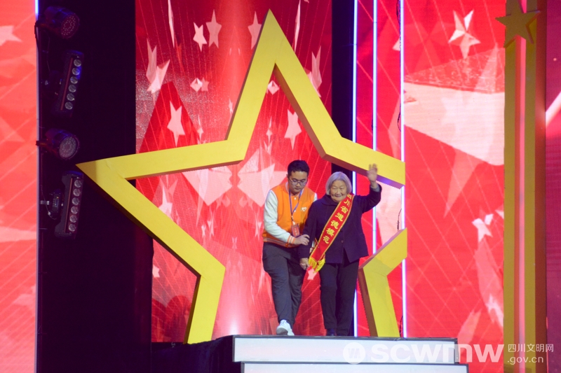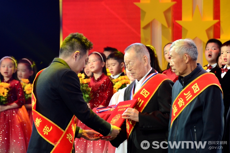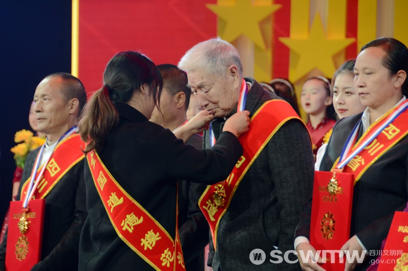 获得第六届四川省孝老爱亲道德模范荣誉称号的有:为了完成丈夫生前嘱托,40年如一日,悉心照料丈夫养父养母的钟蕙芝(后排右五);20多年来用伟大的母爱培育着一双残疾儿女,描绘了一幅和谐幸福佳美画卷的张春美(后排左五);坚守对去世丈夫的诺言,近20年来悉心照料年迈的公公,带着公公出嫁的刘术群(后排右四);20年来用心照顾瘫痪在床的母亲,失明且无法自理的妻子,用孝心和爱温暖着家庭的崔荫森(后排左四);3650个日子悉心照料从3楼摔下瘫痪在床的儿媳的陈光英(后排右三);身残志坚,在父亲去世后独自在家照顾105岁老母亲的蔡冬凤;照顾年迈瘫痪的父亲、先天残疾生活不能自理的妹妹和两个年幼的侄女,撑起一片爱的绿荫的袁怀强;照顾痴呆妻子和残疾女儿15年,用朴实和执着诠释爱与亲情真谛的许前政(后排左二);30多年来照顾103岁的外婆、患有白内障的64岁妈妈、患有腿疾的67岁爸爸,抚育儿女,用瘦弱的肩膀撑起一个家的措拉(后排右一);面对视力残疾的丈夫和生病的公婆以及视力残疾的孩子,坚强积极、不言放弃的车英姿。他们用人间大爱,诠释勤劳持家的生活真谛;用人间至孝,彰显血脉相融的挚美真情。
