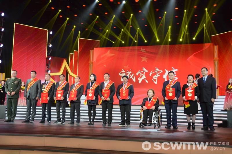 获得第六届四川省诚实守信道德模范荣誉称号的有:创业失败负债后,重振旗鼓还清欠款,不忘初心带领家乡村民脱贫奔康的张家顺(右六);用自己的青春照亮近百位孤寡老人晚年,成为老人们亲人的张巧(左六);坚守“只要你编(竹编),我就收”承诺40年的八旬老人罗万森(右五);坚持四代护英魂的马全民(左五);双拐创业拄出新天地,残者助残大爱无疆的谢北艳(右四);守信为妻弟偿还欠款的杨朝华(左四);吊着尿袋做手术,医者一诺值千金的袁家天(右三);开展田间课堂,带领果农致富的裴忠富(左三);不忘初心,热心慈善,用责任和担当擦亮川北凉粉金字招牌的李华(右二)。他们秉持“言必信,行必果”的信念,用正直端方实践诚至金开的坦荡人生。