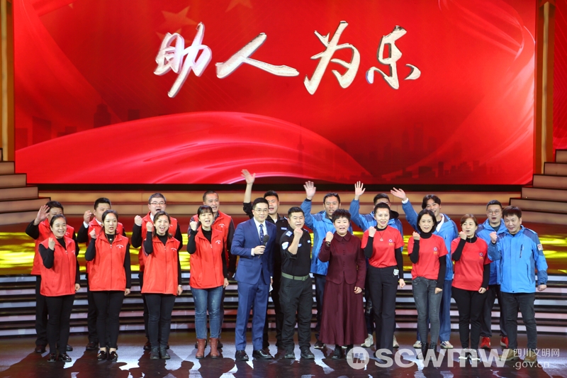 获得第六届四川省助人为乐道德模范荣誉称号的有:在多个领域开展志愿服务,先后挽救300多位白血病儿童生命的傅艳(后排右五);12年来坚持在每个周末为街坊邻里的孩子提供免费辅导培训,关注下一代健康成长的宋淑芳(后排左五);成立“丁爱谱工作室”,常年开展文明劝导、卫生清扫、治安巡逻、网吧监督等志愿服务活动的丁爱谱(后排右四);14年来扎根留守儿童大县,以舞蹈开启留守儿童自信之路的刘春香(后排左四);奉献半生,情系教育,将毕生积蓄四十万元全部捐给青川中学徐励;半个世纪如一日,亲手为部队官兵纳鞋垫8000多双的陈淑群;40年推广竹荪栽培技术,带动6万余户群众脱贫致富的黄文培(后排右二);收集上万册图书,供居民免费借阅的陈光伟(后排左二);积极参与无偿献血公益活动,累计献血14600毫升的蒋素华(后排右一);20年多来募集各类资金2500多万元,帮助特困群众和贫困学子的马全烈(后排左一)。他们一片真诚,雪中送炭,温暖人心;热心公益,扶危济困,持之以恒。他们用一腔热忱,奏响了荡气回肠的大爱乐章。