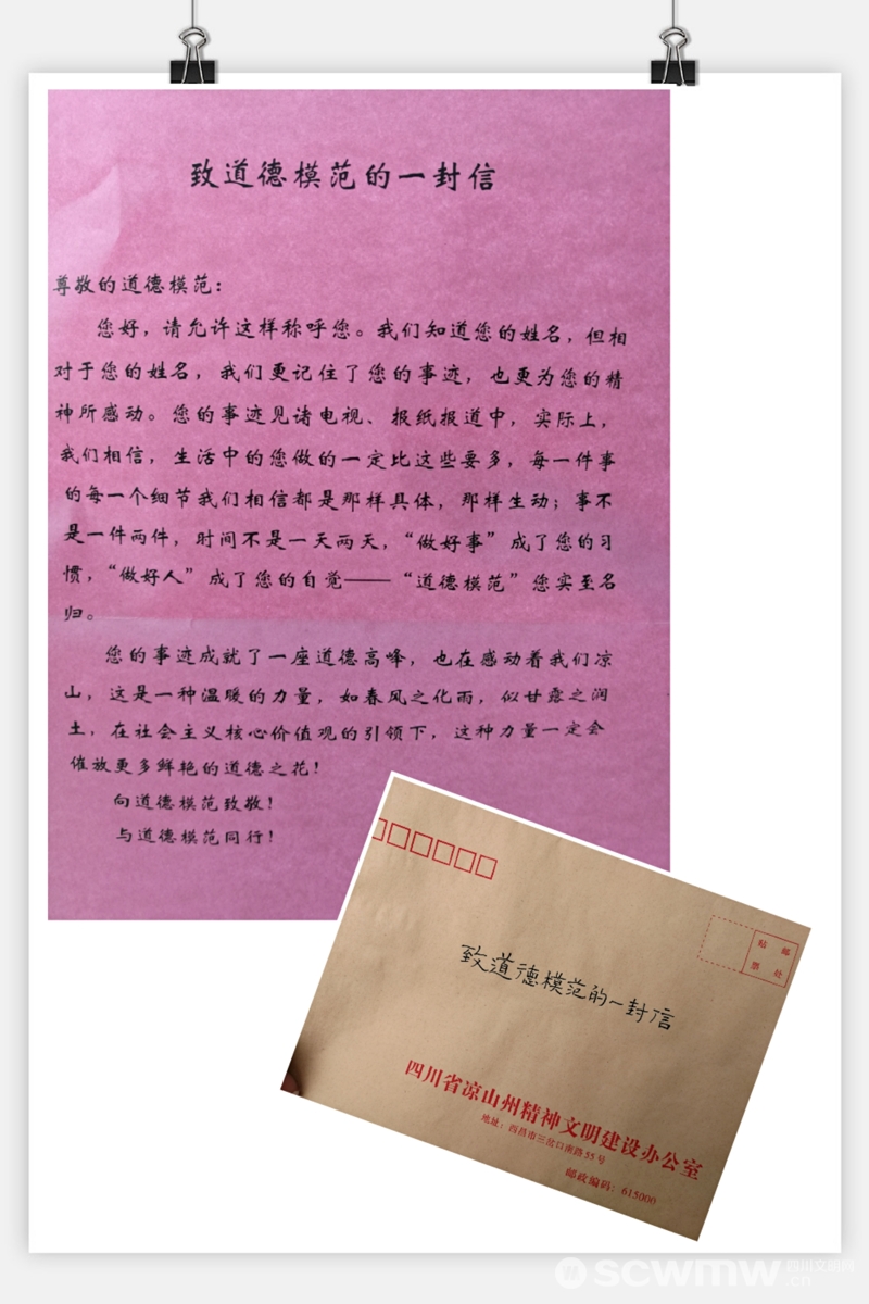 凉山州在致道德模范的一封信中写道:“您的事迹见诸电视、报纸报道中,实际上,我们相信生活中的您做的一定比这些要多,每一件事的每一个细节我们相信都是那样具体,那样生动;事不是一件两件,时间不是一天两天,‘做好事’成了您的习惯,‘做好人’成了您的自觉——‘道德模范’,您实至名归。您的事迹成就了一座道德高峰,也在感动着我们凉山,这是一种温暖的力量,如春风之化雨,似甘露之润土,在社会主义核心价值观的引领下,这种力量一定会催放更多鲜艳的道德之花。”