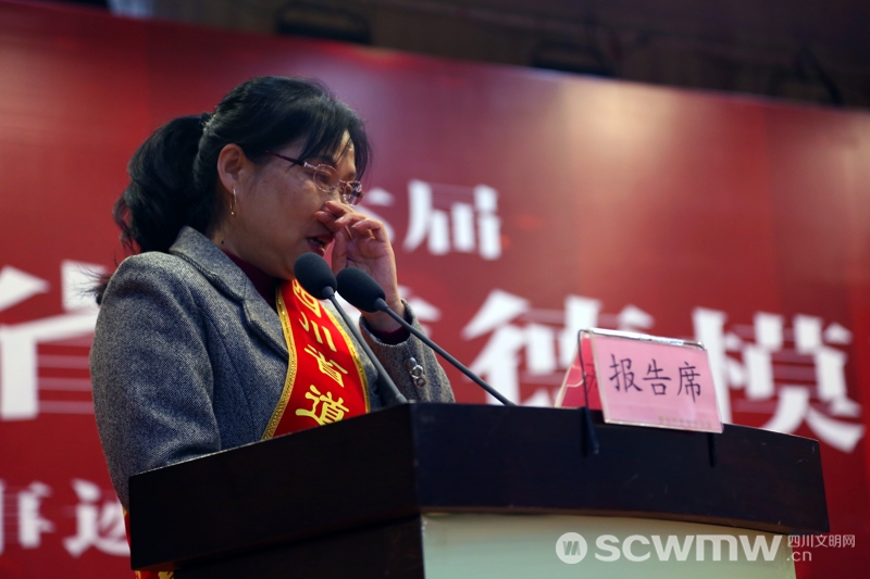 在第六届四川省道德模范事迹巡讲绵阳站,第六届四川省助人为乐道德模范刘春香在分享到一个留守孩子的故事时,感触地落泪。