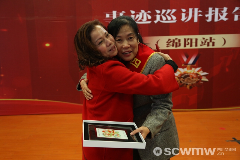 四川文明网绵阳讯(罗园)“刘老师,您的事迹很动人,我要向您学习!”绵阳市安州区的志愿者代表邓丽萍和刘春香紧紧拥抱在一起。听了刘春香的事迹后,曾帮助过残疾孩子和贫困孩子的她感同身受,热泪盈眶。11月20日上午,第六届四川省道德模范巡讲报告会走进绵阳市。道德模范傅艳、龚志敏、刘春香的动人事迹引发了观众的情感共鸣。不少观众会后来到模范们身边请他们签名、合影。