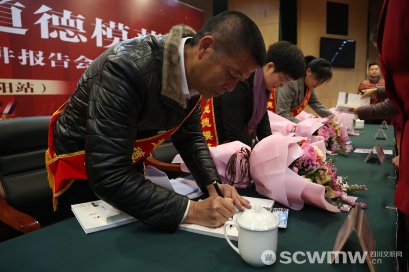 在第六届四川省道德模范事迹巡讲绵阳站,道德模范们受到热情追捧,现场群众纷纷前来请模范签名。