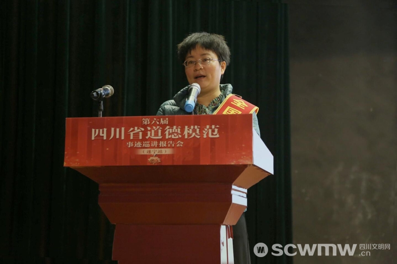 在第六届四川省道德模范事迹巡讲遂宁站,第七届全国道德模范提名奖获得者、第六届四川省道德模范傅艳作报告。