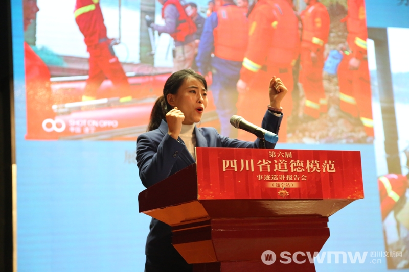 在巡讲报告遂宁站,第七届全国道德模范提名奖获得者、第六届四川省道德模范龚志敏作报告。