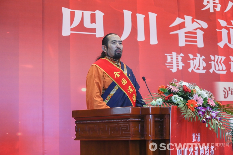 在巡讲报告会泸州站,第七届全国道德模范、第六届四川省敬业奉献模范其美多吉作报告。