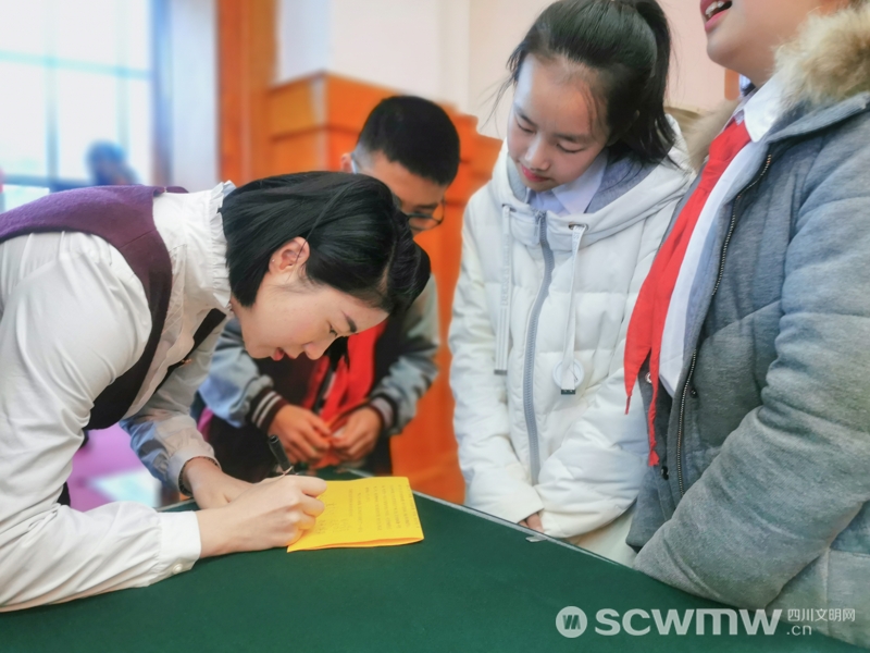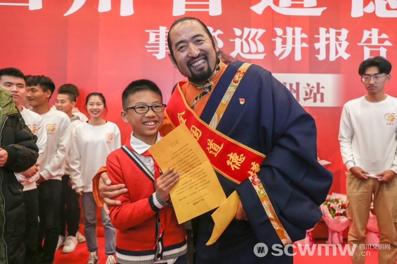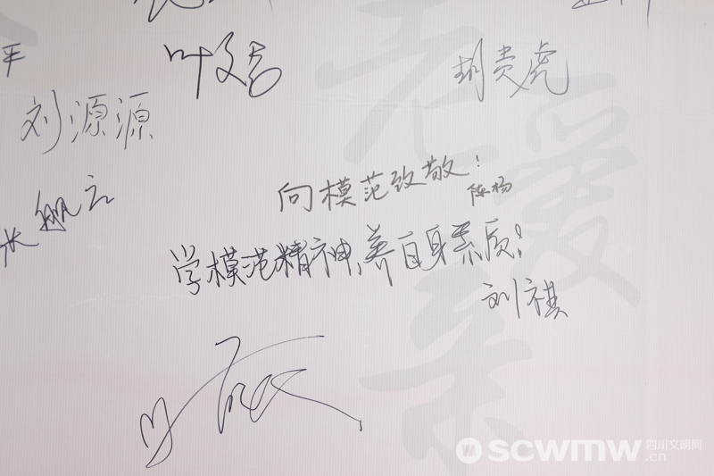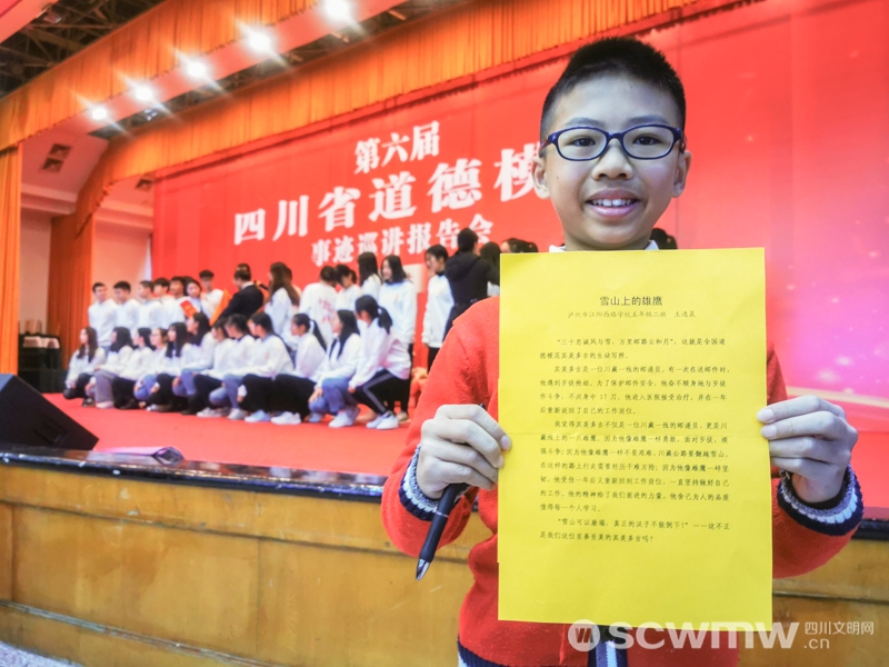 活动结束后,观众们纷纷上台与道德模范们合影留念。泸州市江阳西路学校五年级二班的王逸晨是其美多吉的铁杆“小粉丝”。他为自己争取到了给道德模范献花的机会,并给其美多吉写了一封信:“其美多吉老师不仅是一位川藏一线的邮递员,更是一只雄鹰,因为他像雄鹰一样勇敢,像雄鹰一样不畏艰难,像雄鹰一样坚韧……”王逸晨将这封信送给了其美多吉,并开心地拿到了其美多吉的签名,“其美多吉老师和我说要好好学习,天天向上,我一定做到。”