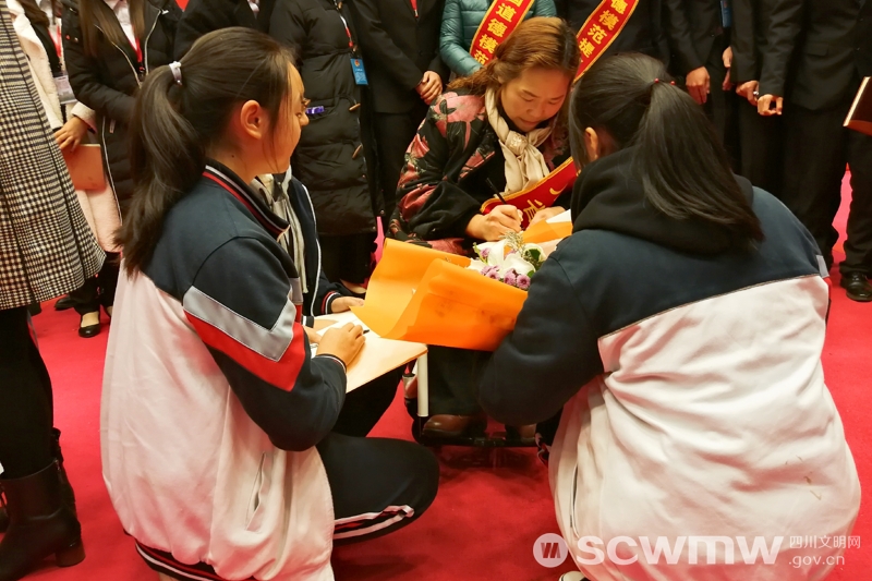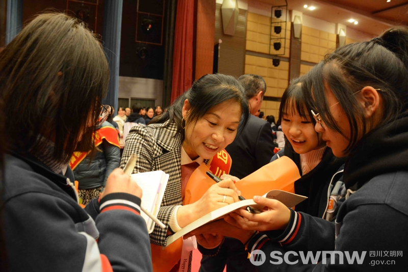 巡讲报告会资阳站现场,“粉丝”争相与道德模范拥抱、握手,请道德模范留下寄语。图为谢北艳为学生寄语。