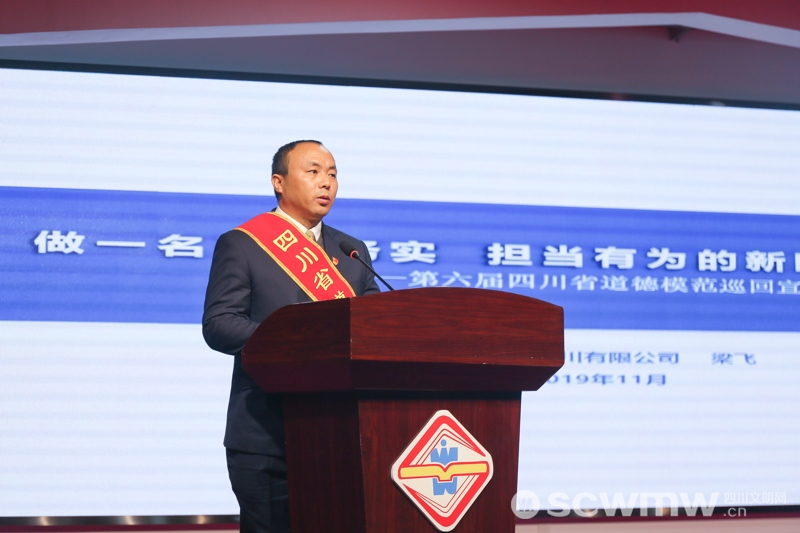在巡讲报告会阿坝站,第六届四川省敬业奉献模范梁飞作报告。