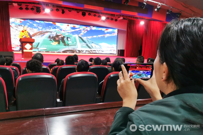 汶川县邮政公司副总经理梁海燕录下其美多吉的宣讲过程。