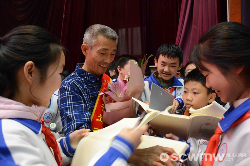 会后,孩子们请道德模范为自己签名寄语。图为眉山籍第六届四川省道德模范李水源为孩子们签名。