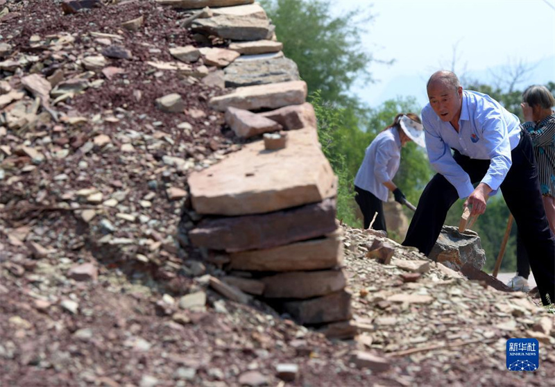在林州市任村镇盘龙山村,王生有(前)带领村民清理乱石,维护道路(2019年7月3日摄)。新华社记者 李安 摄