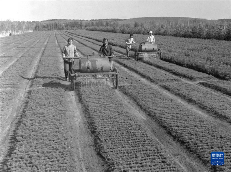 在塞罕坝机械林场,苗圃工人给松树苗浇水(资料照片)。新华社记者 佟德印 摄
