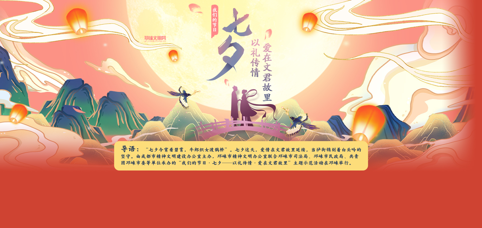 七夕当天,邛崃市新时代文明实践中心联合邛崃市民政局为邛崃市15对新人在凤求凰公园完成人生的一大仪式,并用诗句为七夕的新人们送上“愿得一心人,白首不相离”的盲盒礼物,并通过新人写诗署名、发放《文明婚俗新风倡议书》等方式为新人送上新婚祝福和倡导宣传文明婚俗新风尚...【详情】