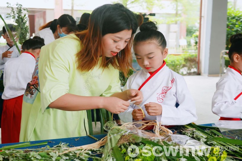 来自达州市善行社会工作服务中心、达州市凤凰山下爱心联合会、国网达州供电公司“红杜鹃”志愿服务队的志愿者陪同学们包棕子、绣香囊,志愿者一边给同学们介绍包棕子、秀香囊所需的材料和步骤,还手把手教同学们动手尝试。