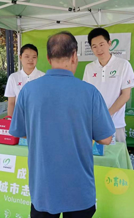 成都大运会不仅是国家和城市的体育盛会,更与成都的每一位市民息息相关。长天路社区时尚运动公园是附近市民开展体育运动的绝佳场所,在这里,来自四川省冶勘物流有限公司、成华区万年场街道办事处和成都理工大学的志愿者们,热心地为来往市民们解答疑惑,与市民们共享大运盛会。