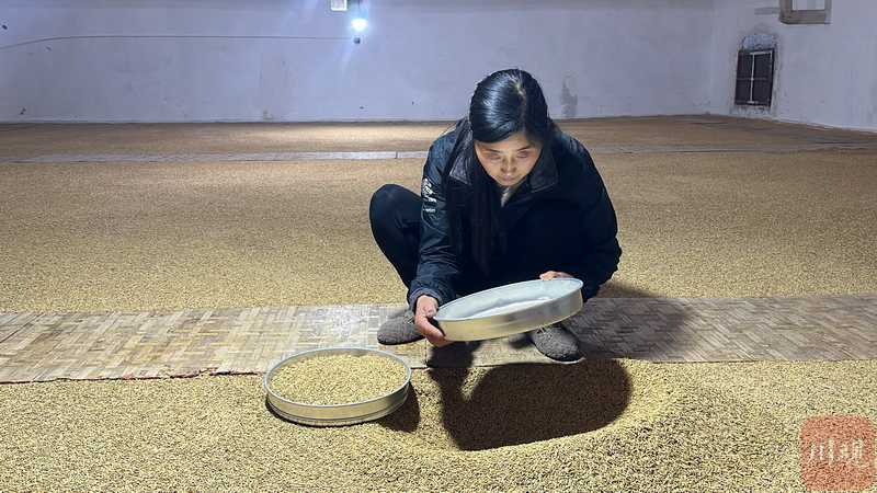 蒲丽蓉正在对储粮进行筛虫。白川东 摄