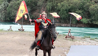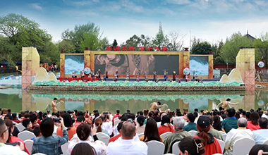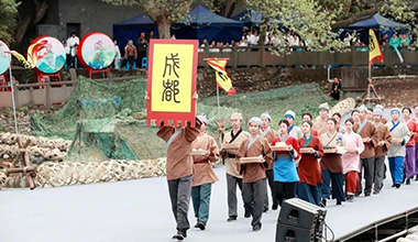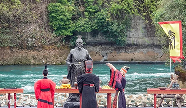 每年清明,在都江堰的“放水”祭祀仪式上,总能看到这样的场景:河道之畔旌旗招展,万众肃穆, 随着主祭官一声令下, 莽号手们吹响雄壮的莽号,蓑衣男子在号声中跳起杩槎舞,戴着古傩面具的壮汉摇着风铃跳起祭祀的傩面舞蹈,展现了古蜀文明的浓郁、神秘、古朴……歌号中,主祭官和两位陪祭官缓缓步上圣台,一幅模仿汉朝仪轨的都江堰放水祭祀图立刻展现在眼前:祭官戴冲天方冠、披锦绣长袍,端高香绕场祈福,跪拜河神、天地,再上香于香鼎之中,表达人们对风调雨顺、国泰民安的祈祷。【详情】
