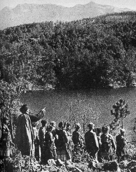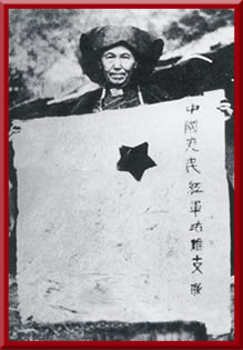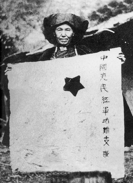刘伯承任命小叶丹为“中国彝民红军沽鸡支队”支队长,并赠与队旗。图为凉山解放后,小叶丹的妻子将队旗献给人民政府。
