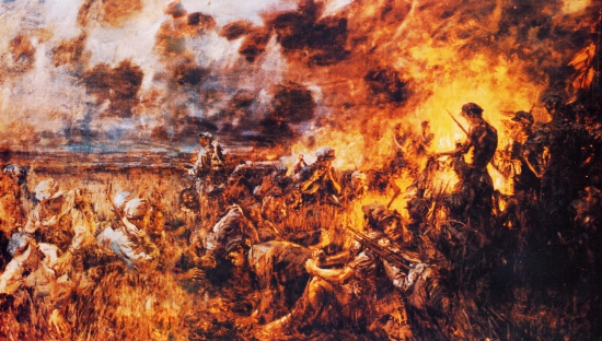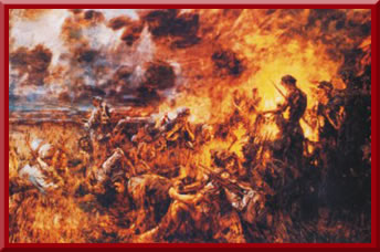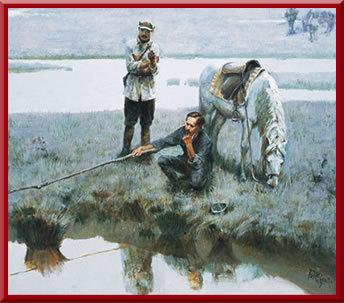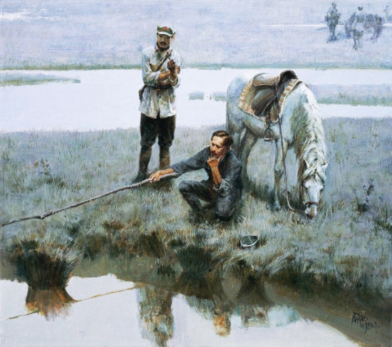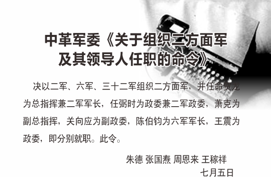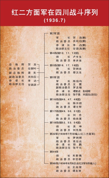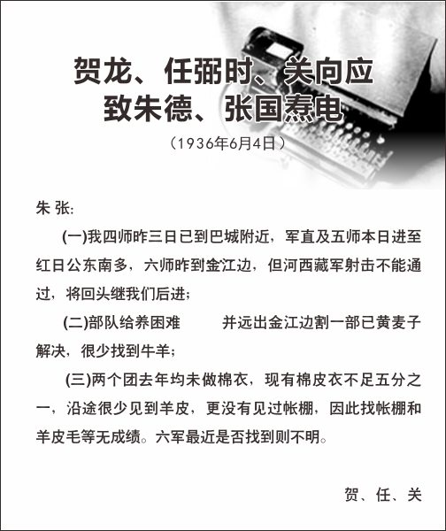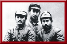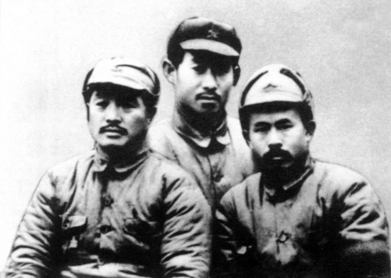 红2军团团长贺龙(左)、政治委员任弼时(右)、副政治委员关向应(中)在长征途中。
