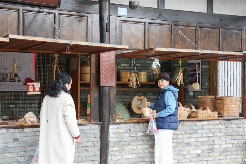 离开新时代文明实践站,采访团一行向着“乡村十八坊”走去。2018年8月开业的乡村十八坊,是集生产、研学、体验、展览等功能于一体的文旅项目,由战旗村自筹资金、自主设计经营。这里有郫县豆瓣、蜀绣、唐昌布鞋等30余种非遗手工作坊,采用“前店后坊”的川西传统作坊模式,还原旧时生产场景,游客可以沉浸式感受非遗工艺的魅力。