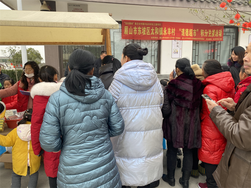 村民排队用积分兑换物品。(东坡区文明办供图)