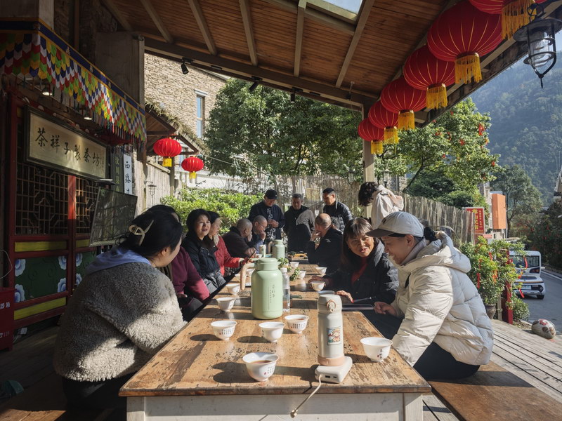 四川文明网讯(施华琼 罗园)11月20日,正值羌历新年假期,四川省阿坝州汶川县映秀镇上羌红高悬,喜庆氛围浓厚,沿街摆放的坝坝宴吸引了不少游客驻足拍摄。而穿过热闹的街头,“茶祥子”制茶坊门前别有一番惬意景象——阳光斜照,茶香弥漫,十多位茶客围坐在长条木凳上,捧着热气腾腾的砖茶,或闲谈说笑,或对弈消遣,悠然自得。