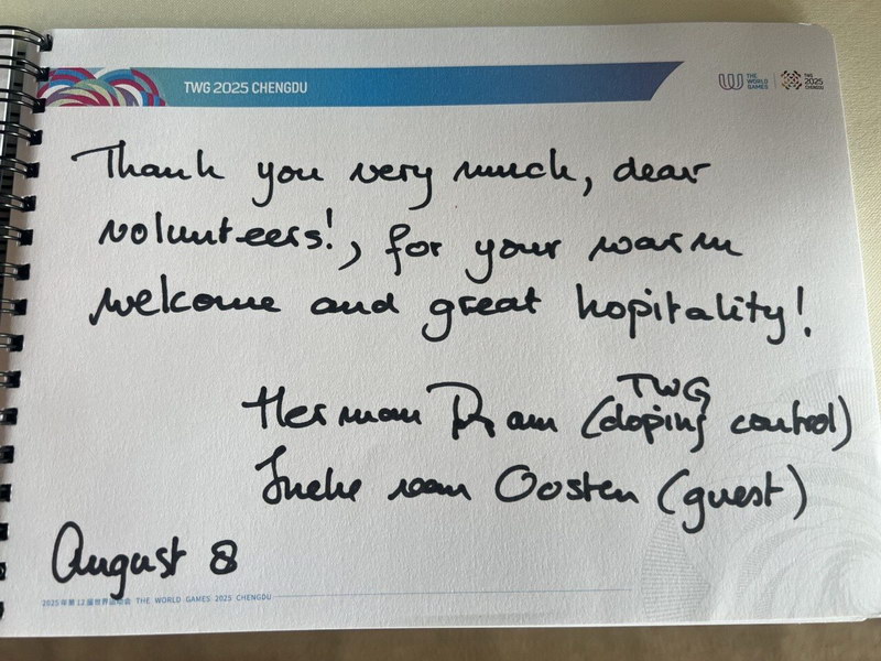 “非常感谢亲爱的志愿者们,感谢你们的热情欢迎和周到的款待!”近日,成都世运会龙泉驿赛区青龙湖射箭场馆中心的意见簿上,反兴奋剂委员会委员荷曼・兰姆及其妻子写下对成都志愿服务的感谢。