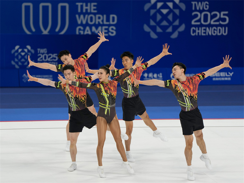 8月15日,中国队在比赛中。当日,在2025年成都世运会健美操五人操决赛中,中国队获得冠军。新华社记者 胥冰洁 摄