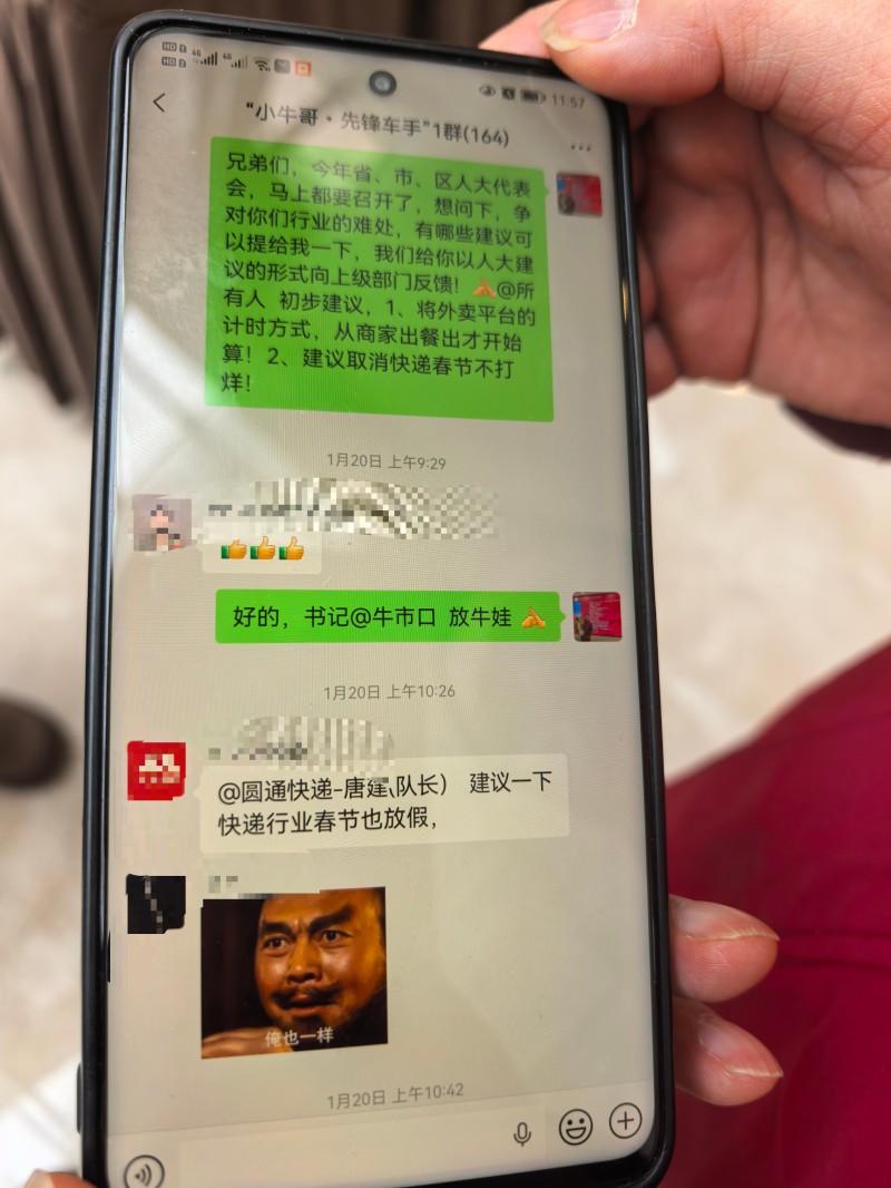 今年省两会前,唐建依旧深耕基层调研,在骑手和快递员微信群里征集建议时,一个诉求让他格外揪心——“呼声最高的是‘取消春节不打烊’的规定。”唐建无奈地说,快递小哥几乎全年365天在岗,常年奔波在外,春节是他们唯一能回家陪伴家人的机会,而且春节期间人流量锐减,快递派送常陷入“投递无门、保管无地”的窘境,也容易引发包裹丢失、纠纷等问题,他希望能通过建议,让快递小哥们能安心返乡,与家人共度团圆年。