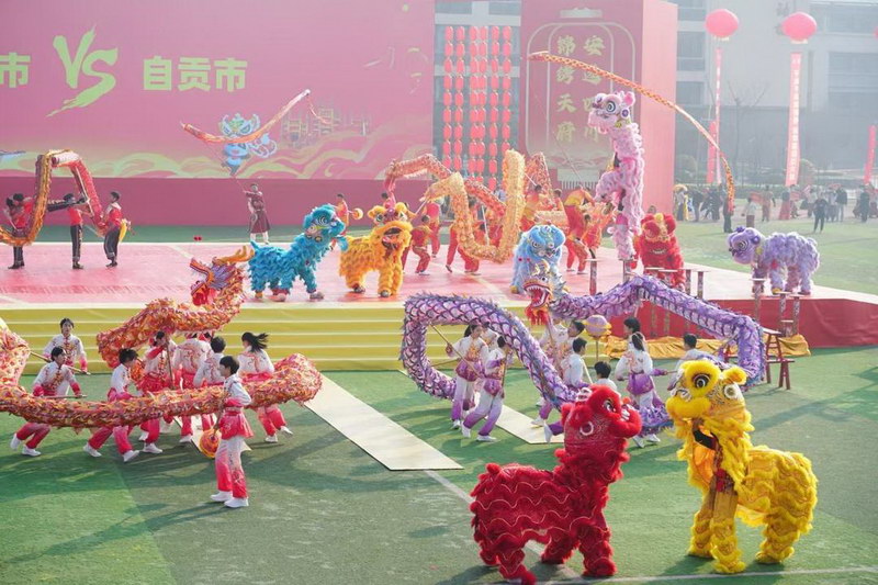 当天上午,活动在自贡衡川实验学校正式启幕。激昂锣鼓声中,700余名龙狮队员精神抖擞、轮番登场,共同献上一场精彩绝伦的文化盛宴。本次龙狮集中展演以《春韵盐都 龙腾华章》《春约富顺 狮舞呈祥》《春满巴蜀 马驰锦绣》三个篇章展开,借《龙的传人》《雄狮少年》《马年红》等歌曲串联,将舞龙舞狮与自贡“盐、龙、灯、食”文化和富顺“千年古县、才子之乡、豆花之城”的城市魅力深度融合,生动绘就“锦绣天府·安逸四川”的文旅新画卷,传递出“龙狮闹新春、巴蜀过大年”的喜庆寓意。