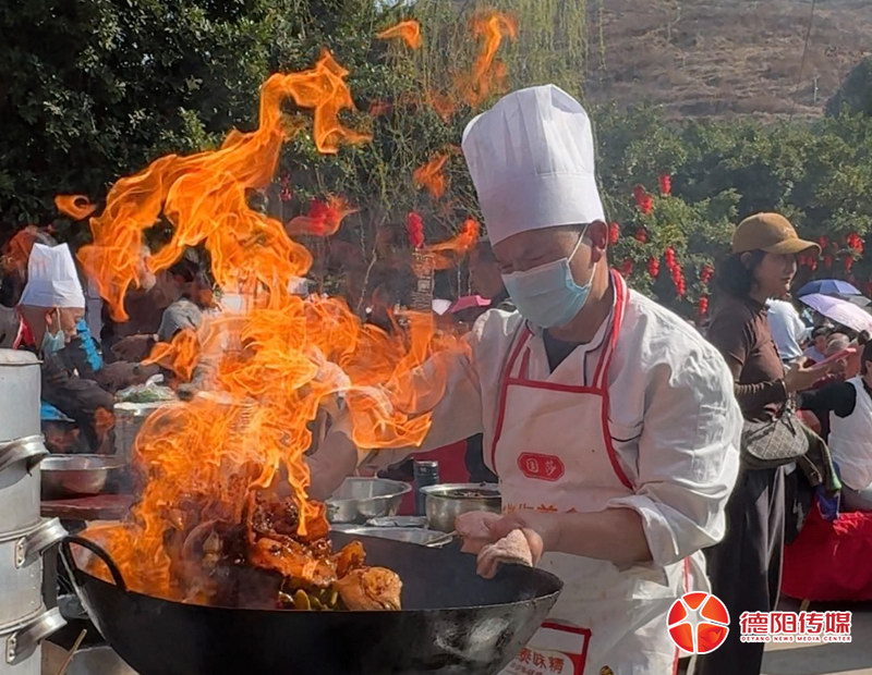 后厨区域,烟火气愈发浓烈。沙田村五家农家乐的大厨带领着自己的团队,忙得满头大汗。帮厨们手持大勺,在直径近一米的大铁锅中奋力翻炒回锅肉,跳跃的火焰不时从锅中窜出,引得围观游客阵阵叫好,拿出手机定格。“从昨天就开始忙着采买新鲜食材,今天早上6点,团队就全员到位准备,虽然辛苦,但我就是喜欢为乡亲们做地道川味,看着他们吃得满意,我心里就踏实。”尹全寿笑着说道。自2016年起,这位村厨便年年掌勺,亲手为大家烹制这份专属的年味儿。