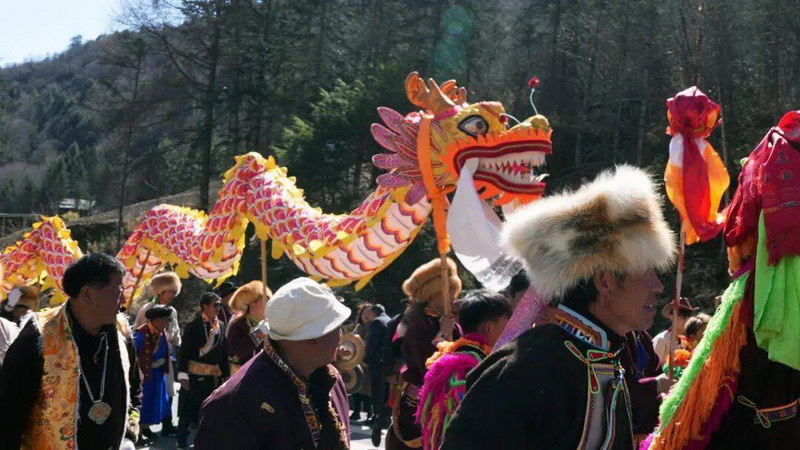 节日当天,当地的居民身穿特色藏装,组成巡游队伍。龙狮腾跃,龙达飞扬,千人锅庄、多声部民歌以及“天鹅抱蛋”等非遗节目接连登场。