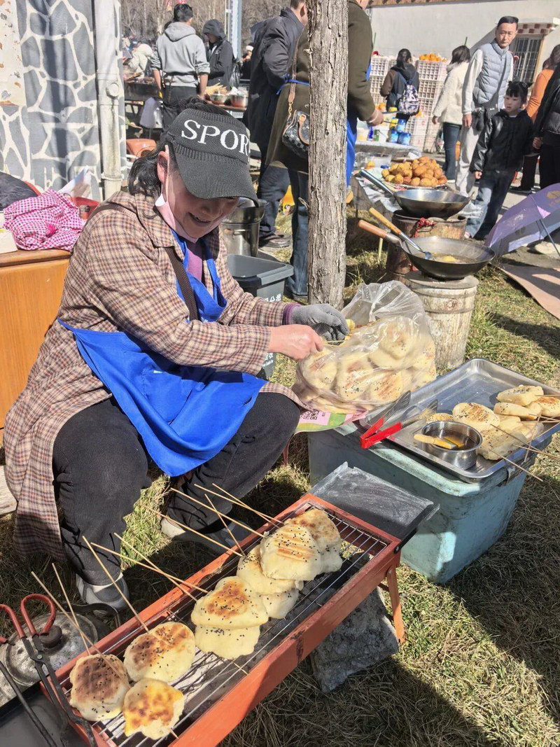 集市上不只有本地人。从成都简阳来的孙山,元旦就把移动咖啡车开到硗碛湖边,今天专门上来摆摊。石棉来的陈鑫带来石棉烧烤和汉源臭豆腐,想试试宝兴有没有新机会。名山的耙耙柑、芦山的酱香饼……四面八方的味道,都挤进这条深山里的节日小巷。