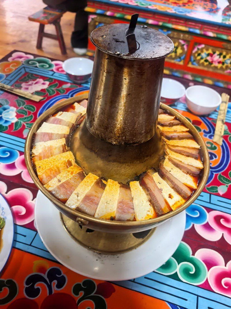 “炊壶”是硗碛藏式火锅的土称。铜锅中间烧炭火,周边一圈码得整整齐齐的食材——藏香猪腊肉切成薄片,配着鲜豆腐,底下垫的是本地特有的几种野菜:山柏菜、山油菜、蕨菜,以及野菌。锅子一端上桌,热气扑脸。