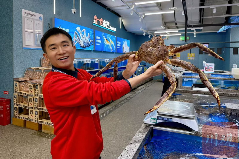抓起一个鲜活摆腿的帝王蟹,盒马宜宾首店负责人李天友告诉记者,除夕当天,宜宾店卖了150多只帝王蟹、800多份三文鱼,比成都任何一家盒马都卖得多。“目前,宜宾市民消费的鲜活帝王蟹绝大多数由盒马供应,盒马能做到72小时从产地直达消费地。”