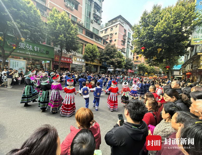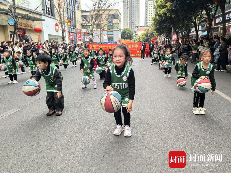 记者注意到,此次的巡游队伍无论是着装还是道具、表演内容等,都特别具有地域特色。其中,非遗队由观斗苗族乡和罗渡苗族乡同胞共同组成,队员身着精美刺绣苗服,以芦笙演奏、苗族舞蹈、祭鼓展演为核心,生动展现苗族儿女热情好客、团结奋进的精神风貌,尽显边界民族风情与文化活力;篮球宝贝队是由40名珙县少年组成,展示出珙县“篮球之乡”的薪火,在少年手中接力相传;上罗镇的队伍深挖非遗底蕴,将市级非遗《珙县舞狮》与民间“二龙戏珠”、彩船相融,金龙腾跃、雄狮欢舞、彩船摇曳、鼓乐铿锵,既展现24项县级非遗、25名非遗代表性传承人的文化坚守,更传递着全镇人民的喜悦与期盼;洛表镇的队伍则融合民俗展演与特色展示,身着“僰人”特色服饰,演绎传统民俗,传递古朴热情。