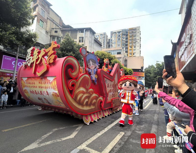 当天15时,随着由彩旗队和花车组成的前导队缓缓前行,2026年珙县“春风策马·珙享团圆”民俗文化大巡游活动正式启动。随后,由非遗队、篮球宝贝队、汉服队、cosplay队、旗袍队以及由珙县11个乡镇组成的上千人的巡游队伍,穿梭在县城的大街小巷,为市民献上了一场精彩的民俗文化盛宴。每当巡游至十字路口等宽阔地带时,巡游队伍还会暂停脚步,为观众表演一段,与观众互动。