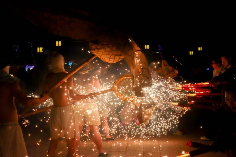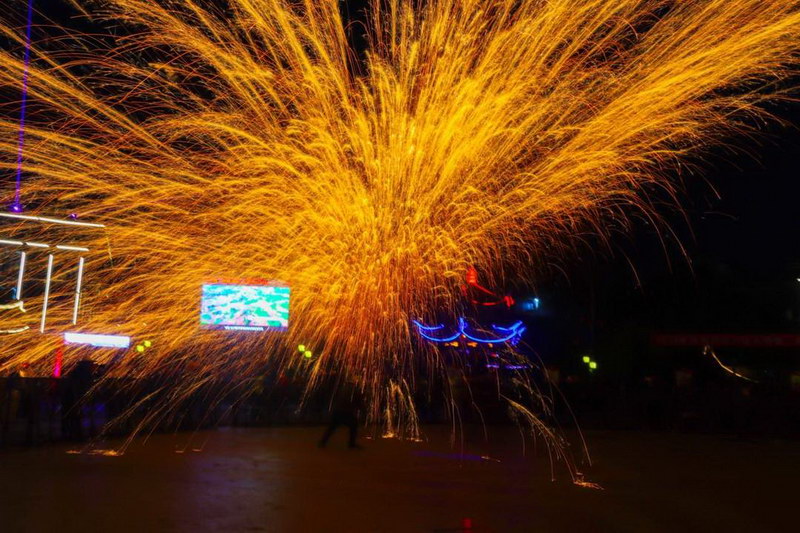 打铁花和烧火龙活动同时进行。曾业 摄