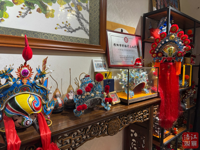 走进汪伟的工作室,就像步入了一个小型的川剧博物馆。除了正在制作的盔头,墙上还挂着凤冠、万卷书、财神脸谱挂件,桌上摆着变脸、吐火的半截面具,房间里码放着一摞摞老戏服、旧盔箱。