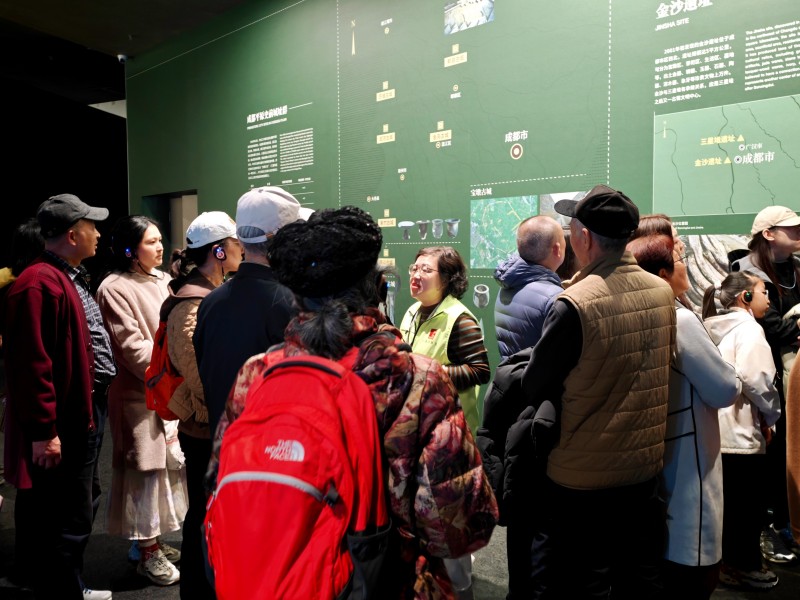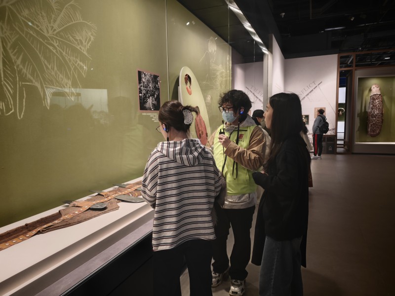 “你们看,这件青铜面具的眼睛为什么这么突出?古蜀人在凝望什么?”一号馆内,讲解志愿者的讲解总是带着问号,吸引着观众好奇的目光。讲解志愿者不仅讲述三星堆的秘密,还通过同期展出的“碧海浮槎——法国国家凯布朗利博物馆藏大洋洲艺术珍品展”带领大家探寻大洋洲文化及人类文明的共通之处。